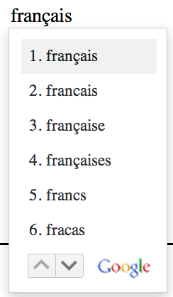 "francais" yazmaya devam ettiğinizde, önerilen kelime otomatik aksan işaretli bir kelime olur. Önerilen "français" kelimesini uygulamak için BOŞLUK/ENTER tuşuna basın.