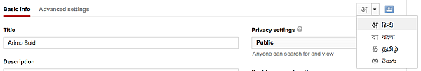 Video oluşturucular için Hint ailesinden çok sayıda dilin harf çevirileri sunulmaktadır. Gizlilik simgesinin yanındaki अ simgesi harf çevirisini gösterir. Harf çevirisini kullanmak için bu simgeyi tıklayın.