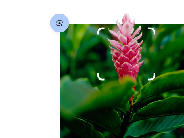Rounded white corners of a square surround a red spiky plant which is identified as red ginger